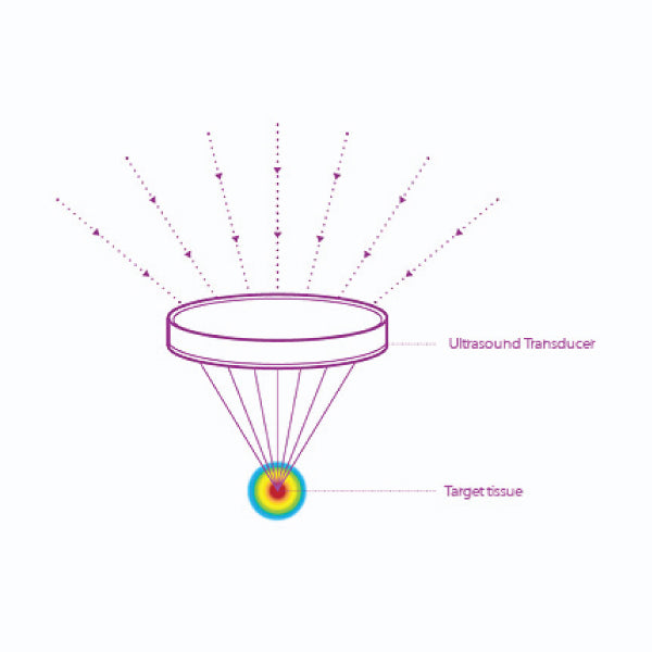 - Procedures using HIFU technology use the high temperature of 65-100℃, generated when applying the high-intensity ultrasound energy on one spot, to burn the target tissue.