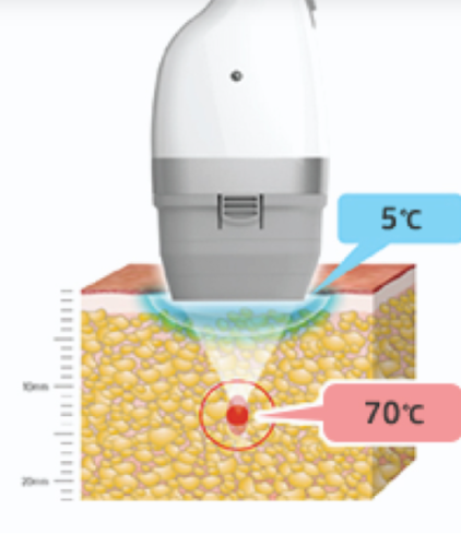 Thermal energy is generated using HIFU technology. With this thermal energy, fat cells are destroyed to reduce the circumference of the waist.